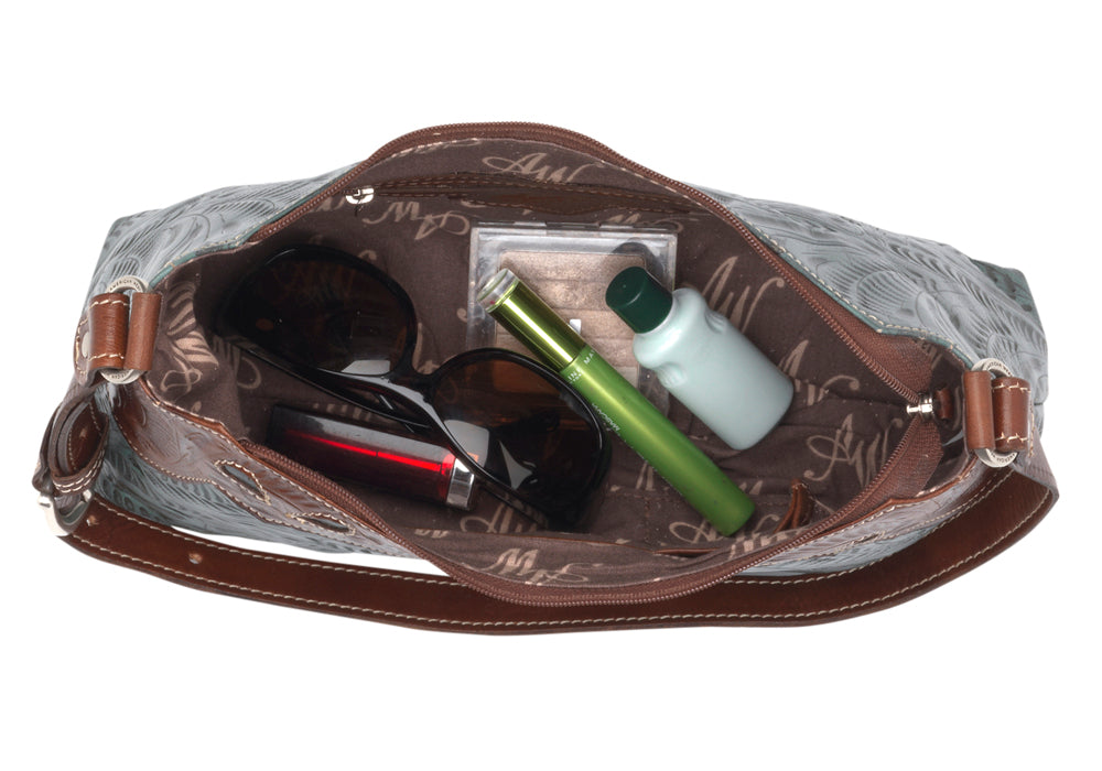 An American West classic styled zip top shoulder bag, cut from vegetable tanned hand tooled antique brown leather. The exquisite basket weave and traditional Western style tooling on the front and back is enhanced with wonderful leather whip-stitching, making this bag exceptional enough to be called a work of art. The signature design is completed with buck-stitching on the handle, antiqued silver spots and an exclusive silver star buckle set.