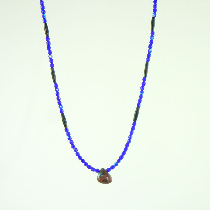 A glittering necklace of Czech Aurora Borealis fire-polished faceted glass beads, Buffalo horn hair-pipes and Australian Boulder Opal, designed and wonderfully hand crafted by Sou'West Nova Metis artist Don Standing Bear Forest. The necklace design consists of 106 uniform size round glass beads and 10 Buffalo horn hair-pipes, which split the symmetrical design into 12 segments. The focal piece is a gorgeous Boulder Opal pendant. The shimmering glass beads are coloured a wonderfully intense dark-cobalt blue and go through a myriad of colour changes in the light. The inky black of the petite Buffalo horn hair-pipes, provides a delightful contrast. The polished Australian Boulder Opal is triangular in shape and has convex and concave faces. The convex face has a background of dark and light chocolate tones, with a beautiful distinctive turquoise ring on the top side. The concave face is a riot of chocolate brown, turquoise, cobalt and light blues with a splodge of white. The necklace could be worn with the stone facing either way. The ends of the necklace are finished with small spherical silver beads and a lobster clasp. The faceted Czech glass has a vibrant, sparkling contemporary style to it, complimented and enhanced by the natural conservative look of the Buffalo horn. What really makes this piece stand out though, is the inspired inclusion of the adorable earthy Opal, a reminder of the traditional origins of jewellery as an adornment.