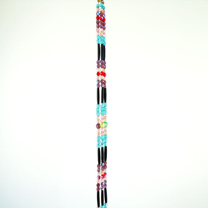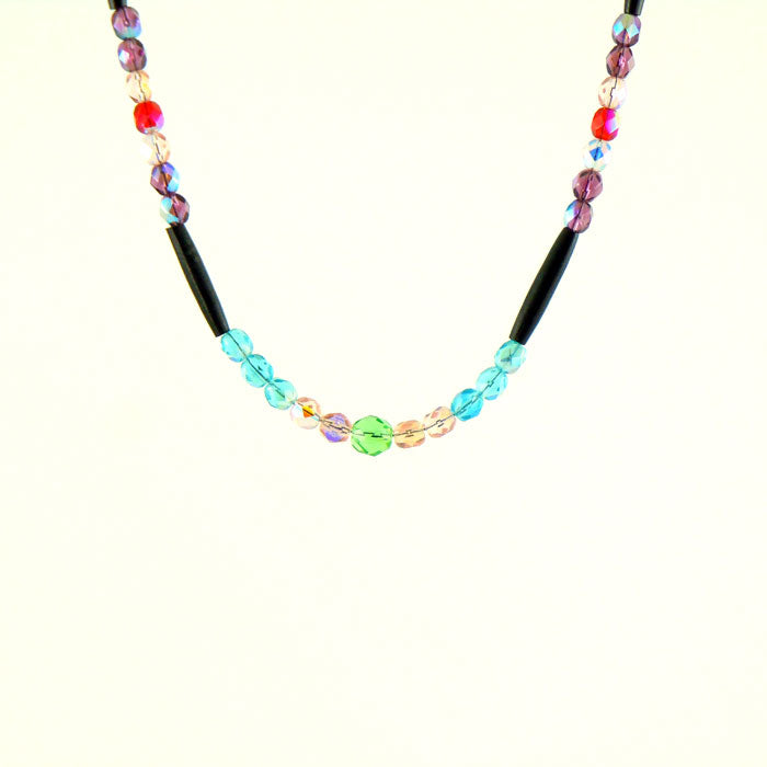 A dazzling necklace of Czech Aurora Borealis fire-polished faceted glass beads and Buffalo horn hair-pipes, designed and expertly hand crafted by Sou'West Nova Metis artist Don Standing Bear Forest. The symmetrical design consists of 44 uniform size round glass beads plus 1 larger focal bead in the centre. The 4 black Buffalo horn hair-pipes emphatically split the string into 5 distinct segments. The shimmering glass beads are coloured red, aqua, pink and amethyst. The choice of focal bead is green, amethyst or yellow. The ends of the necklace are finished with small spherical brass beads and a brass lobster clasp. The sparkling contemporary style of the polished glass is wonderfully contrasted and enhanced with the natural conservative look of the Buffalo horn. In doing this Don has created a bright, fun piece of jewellery for a night out, but which has that little touch of reserve that makes it perfect for the office too.