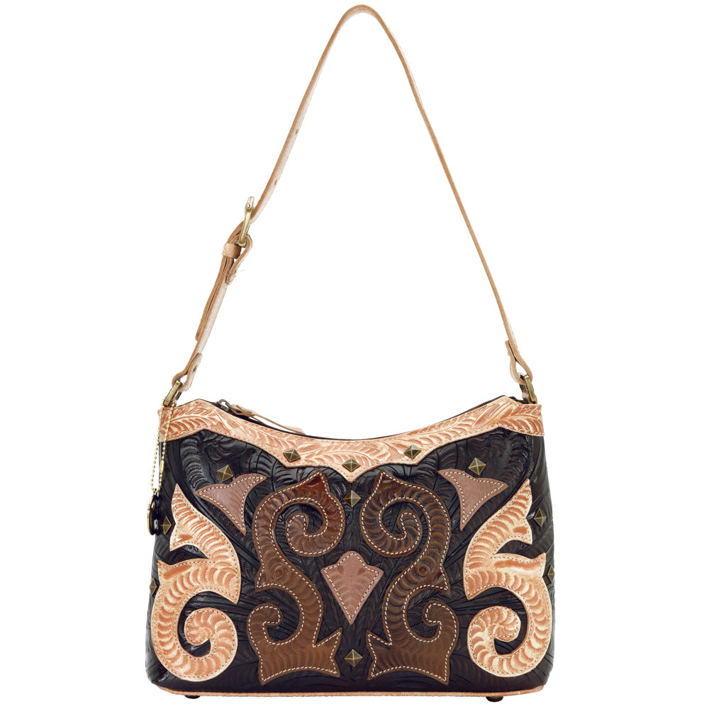 An elegant American West zip top shoulder bag, cut from vegetable tanned hand tooled chocolate leather front and back and decorated with adorable leather applique swirls and arrowheads. The bag is trimmed in distressed cream leather with a matching strap. The applique palette of hand tooled leather is distressed cream, earth and dusty rose, all wonderfully accented with signature brass pyramid spots.