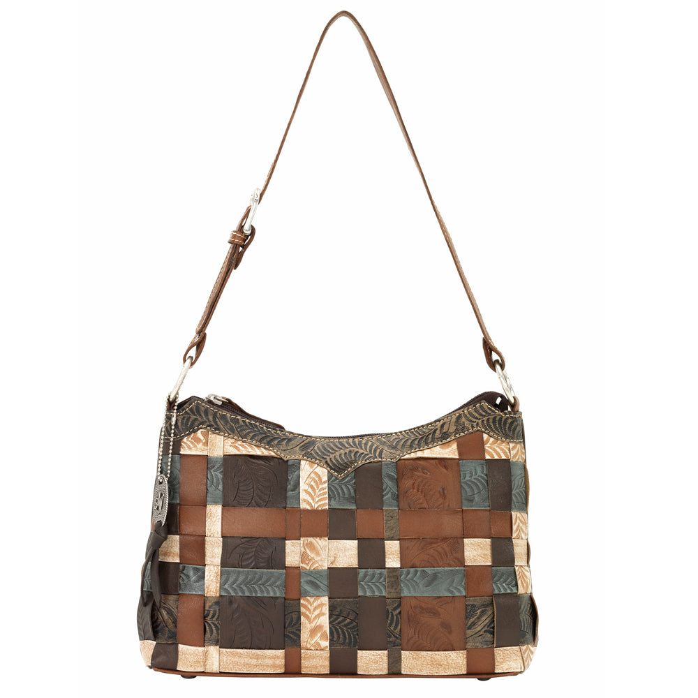 A gorgeous zip top panelled leather shoulder bag in a distinctive American West style. The body of the shoulder bag is created from distressed charcoal brown, antique brown and chocolate leathers. The lovely leather panels are a palette of distressed cream, antique turquoise, chocolate, antique brown and distressed charcoal brown leathers, beautifully woven together by hand. The design is completed with intricate hand tooling on the back.