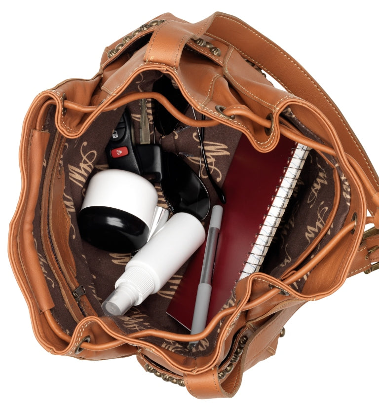 A gorgeous American West drawstring crossbody bucket style bag, cut from silky soft tumbled olive green chrome leather and beautifully accented to create a bold look. The accents are rows of smooth and fluted antiqued brass spots on the front and sides. The overall look is complimented by contrast stitching. The singular American West design is both elegant and casual and totally suitable for everyday use.
