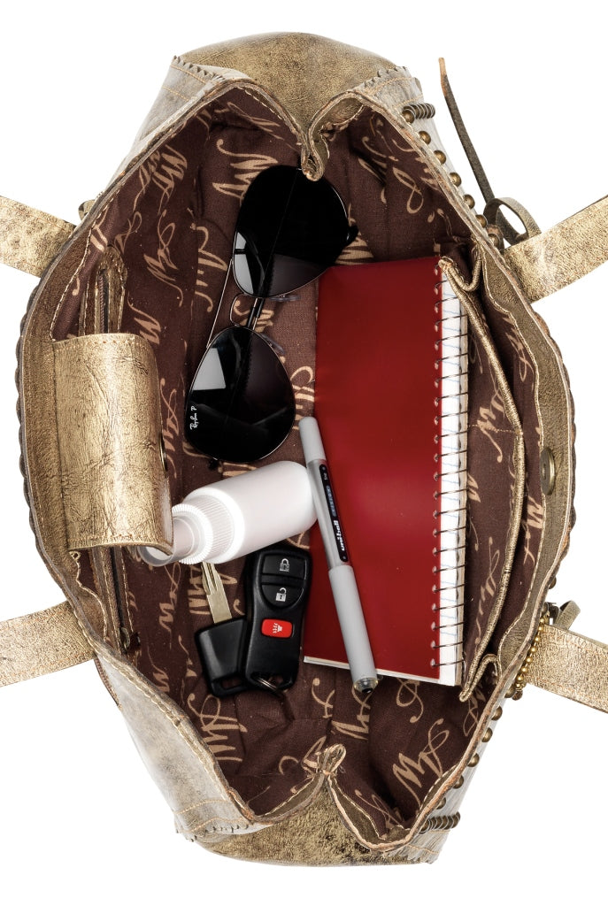 A signature American West large shopper tote bag, cut from olive green vegetable tanned leather and tastefully accented and hand tooled to create a classic look. The bag has lovely scalloped edges with contrast stitching throughout. The front is accented with small smooth brass spots and the slip pocket is hand tooled with large flowers. The design is completed with lovely leather tassels. An elegant American West signature design and big enough for all your essentials.