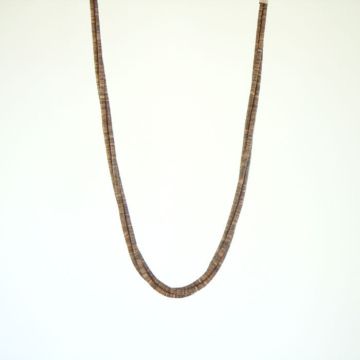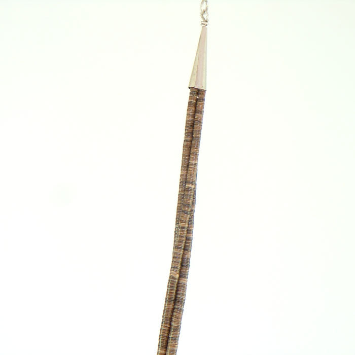 A traditional 3 string heishi necklace of baby olive shell, designed and hand made by accomplished IACA award winning Kewa Pueblo artist Lorraine Cate. The petite olive shell beads are of traditional colouring and vary from the darkest brown through beige and even black to produce a lovely contrast on the strings. This delightful necklace design showcases the talents that Kewa artists are renowned for and achieves a subtle and elegant look. The necklace has 2 sterling silver cones, stamped with American Indian symbols, as part of the clasp. The piece features Lorraine's signature solitaire bead, of turquoise in this case. The necklace sits well, is very light, smooth textured and comfortable. Gorgeous and understated fashion jewellery that connects the wearer to the artist's story.