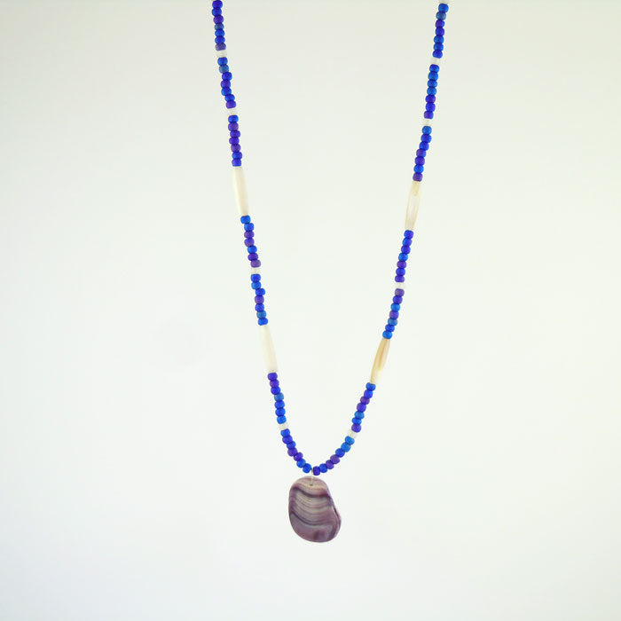 A beautiful, traditional necklace of glass seed beads, shell hair-pipes and a stunning quahog shell pendant, designed and hand crafted by Sou'West Nova Metis artist Don Standing Bear Forest. The eight segment symmetrical design consists of 104 violet-purple opaque matte seed beads, 10 matte white seed beads and 4 white shell hair-pipes. The focal point is a stunning, one of a kind purple quahog shell pendant. Purple quahog shell is still highly prized and the most desirable for fashioning traditional wampum. The pendant is removable, with care, to use as a chic piece of jewellery on its own or with another favourite necklace. The necklace has a lobster clasp. The colour coordination of beads and hair-pipe in this piece is just perfect and picks out the natural quahog palette in a very pleasing way, that doesn't overwhelm the beauty and serenity of the pendant. Although reportedly used as currency for centuries, wampum still holds a much broader and deeper significance in the social and spiritual values of American Indian culture. Don's work showcases and upholds those values in every respect.