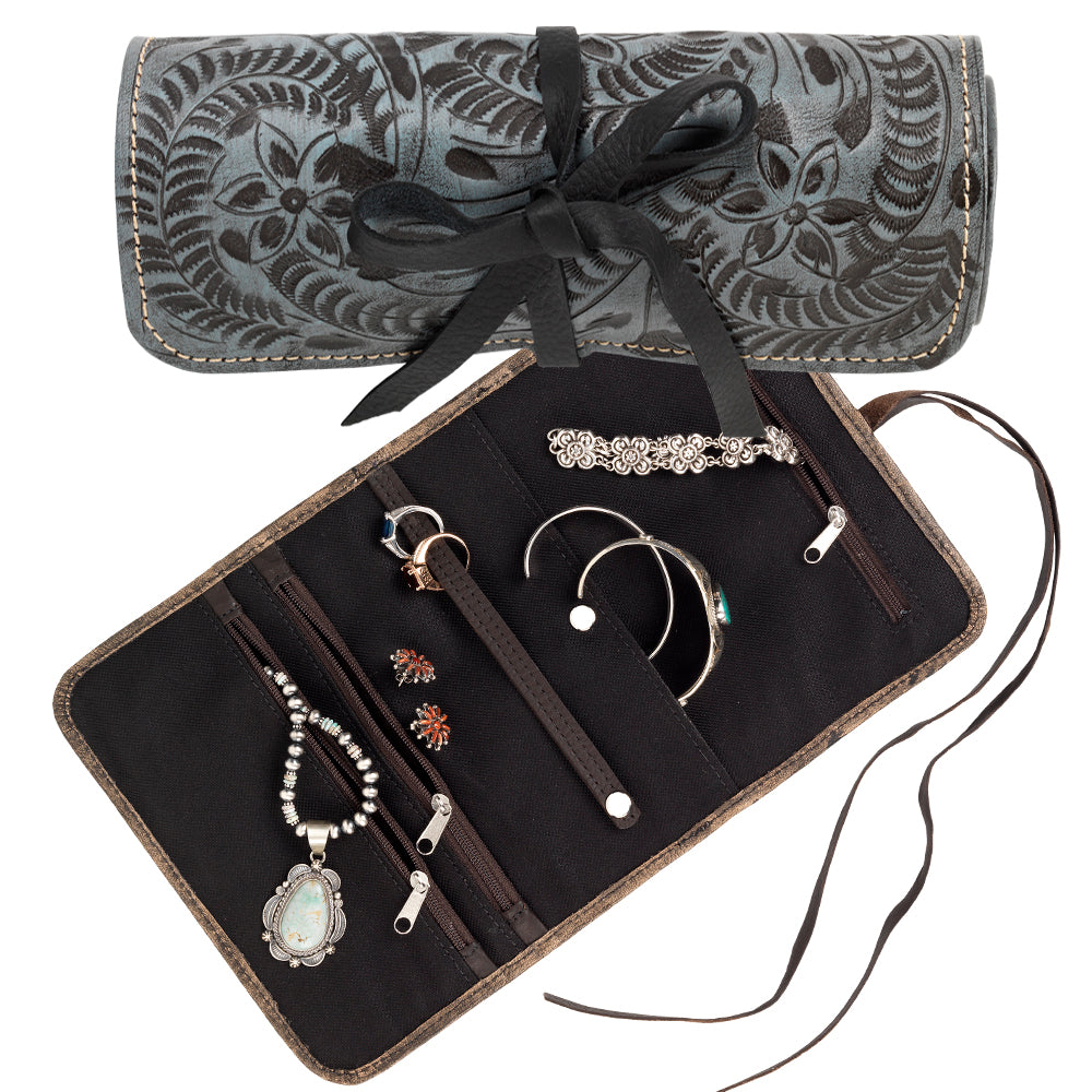 A distinctive leather travel jewellery roll design by American West, to keep your treasures safe and secure on your journey. The roll has a vegetable tanned hand tooled distressed sky blue leather exterior, with a durable black interior. The roll is wrapped and secured with gorgeous black chrome leather ties. The ideal birthday travel gift.