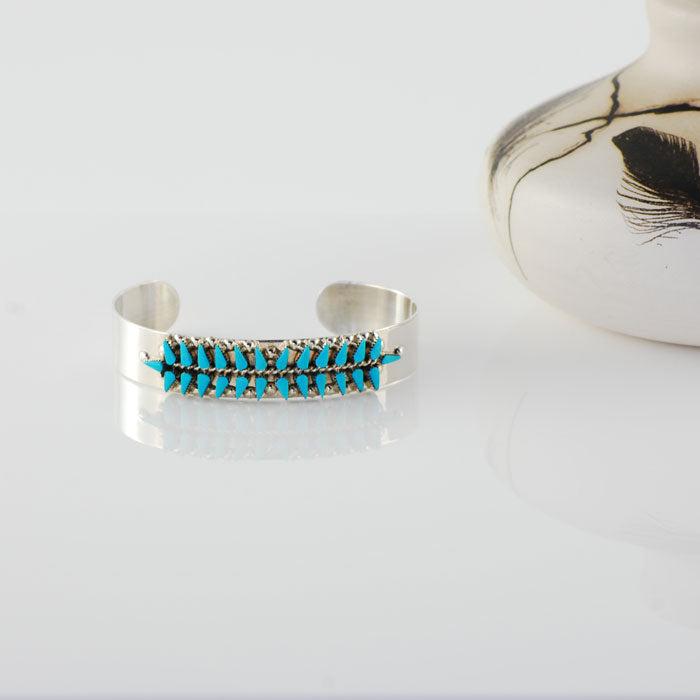 A stunning sterling silver and Sleeping Beauty turquoise petit point cuff bracelet, designed and hand made by distinguished Zuni artist Vera Halusewa. This uniquely Zuni design consists of a mirror finish cuff, overlaid with a sterling silver mount, richly decorated with silver roping and spots. The breath-taking Sleeping Beauty turquoise petit point consists of 26 teardrop shaped stones, individually mounted in two symmetrical clusters. The colour palette is a consistent light-mid blue tone with no visible matrix. Zuni petit point jewellery is a unique form of art and takes many hours to create. This gorgeous piece, by a stellar Zuni artist, showcases their intricate work and attention to detail. This form of jewellery is not made anywhere else and has made the artisans famed the world over.